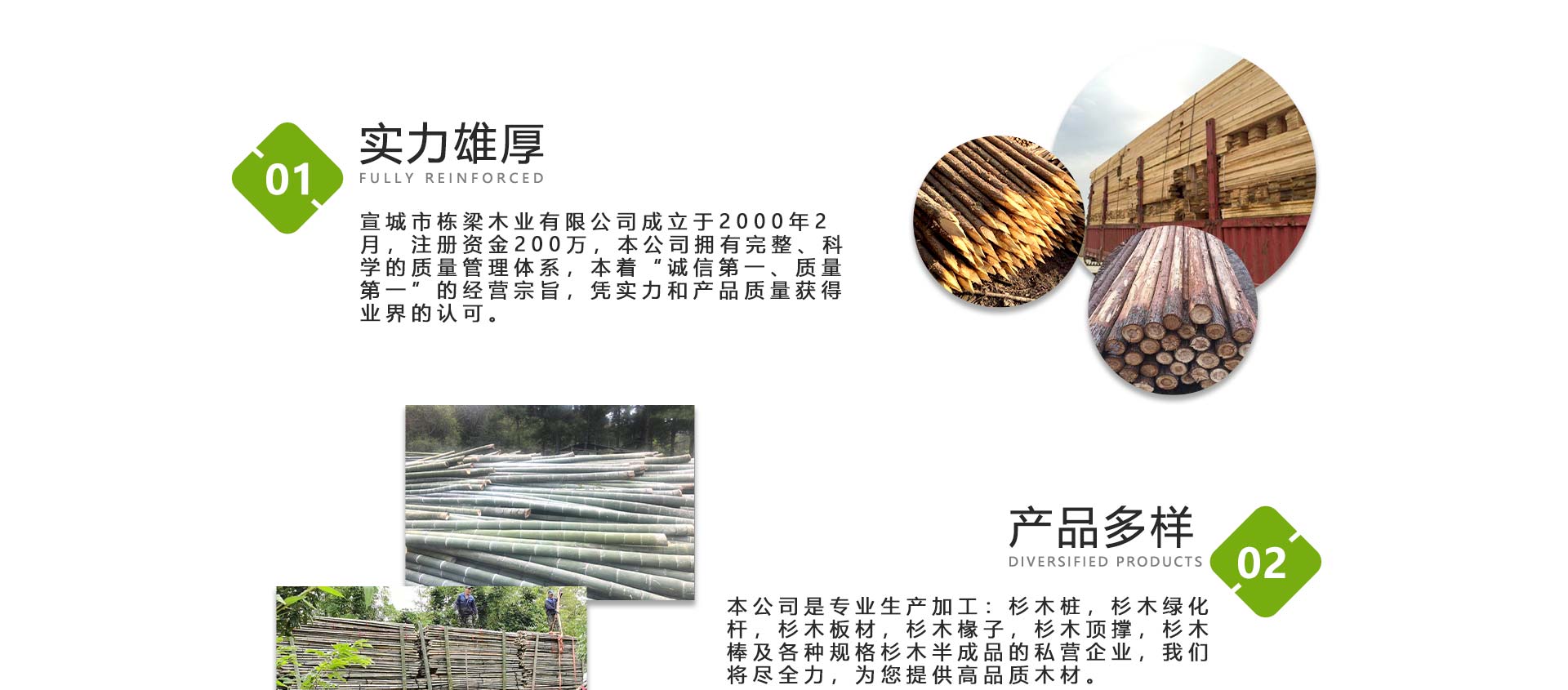 宣城市棟梁木業(yè)有限公司成立于2000年2月,注冊(cè)資金200萬(wàn),是專(zhuān)業(yè)生產(chǎn)加工:杉木樁,杉木綠化桿,杉木板材,杉木椽子,杉木頂撐,杉木棒及各種規(guī)格杉木半成品的私營(yíng)企業(yè),本公司擁有完整、科學(xué)的質(zhì)量管理體系,本著“誠(chéng)信為先、質(zhì)量保證”的經(jīng)營(yíng)宗旨,憑實(shí)力和產(chǎn)品質(zhì)量獲得業(yè)界的認(rèn)可。歡迎各界朋友蒞臨本公司參觀(guān)、指導(dǎo)和業(yè)務(wù)洽談。